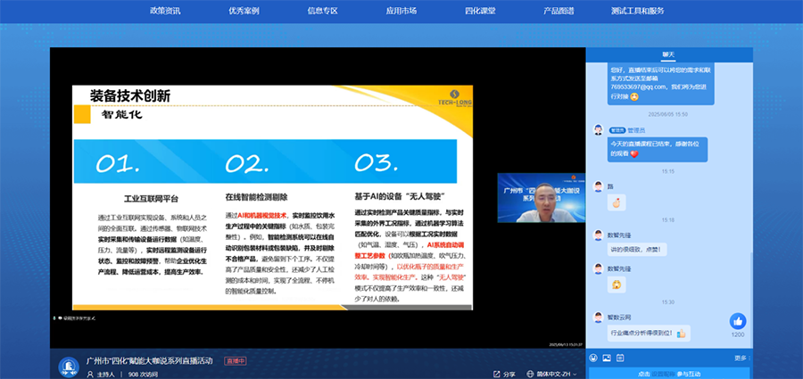 ????2025年6月19日,在廣州市工業(yè)和信息化局的精心指導(dǎo)下,廣州市“四化”賦能大咖說系列直播第二期圓滿舉辦。本次活動(dòng)聚焦制造業(yè)數(shù)字化、網(wǎng)絡(luò)化、智能化、綠色化轉(zhuǎn)型路徑探索,作為行業(yè)轉(zhuǎn)型標(biāo)桿企業(yè),達(dá)意隆受市工信局邀請(qǐng),由公司監(jiān)事、企劃部副總監(jiān)兼高級(jí)工程師梁殿勝代表出席,圍繞包裝裝備與食品行業(yè)實(shí)戰(zhàn)經(jīng)驗(yàn),介紹并分享數(shù)字化智能化經(jīng)驗(yàn),與行業(yè)同仁共話“四化”轉(zhuǎn)型新未來。